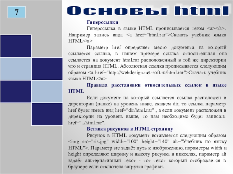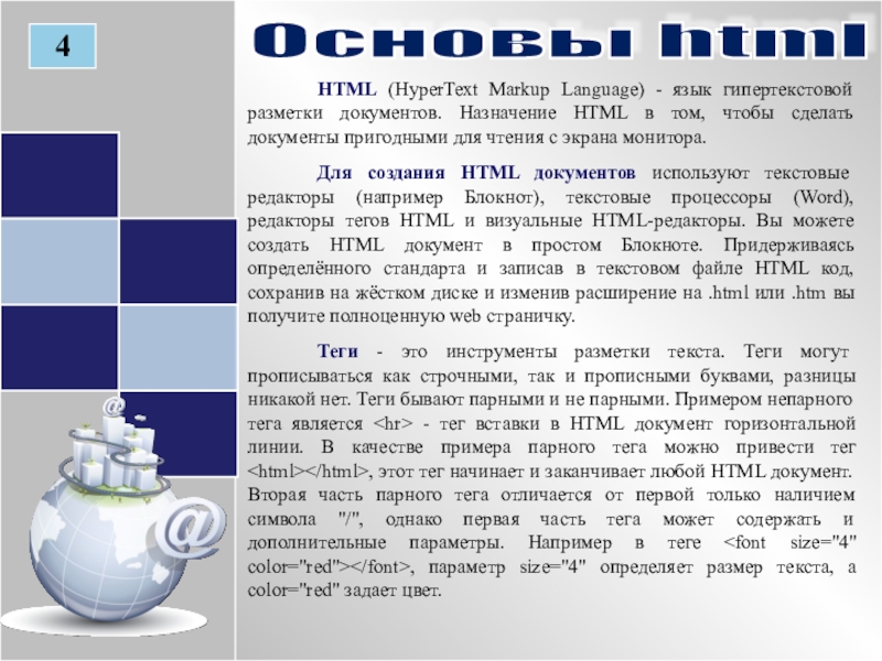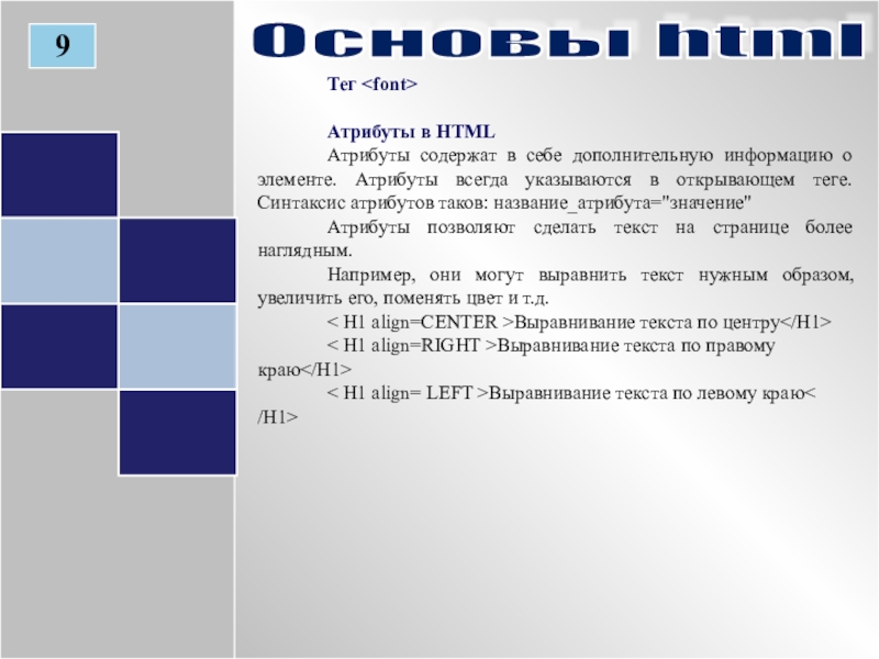 элементе. Атрибуты всегда указываются в открывающем теге. Синтаксис атрибутов таков: название_атрибута="значение" Атрибуты позволяют сделать текст на странице более наглядным. Например, они могут выравнить текст нужным образом, увеличить его, поменять цвет и т.д. < H1 align=CENTER >Выравнивание текста по центру < H1 align=RIGHT >Выравнивание текста по правому краю < H1 align= LEFT >Выравнивание текста по левому краю< /H1> Основы html