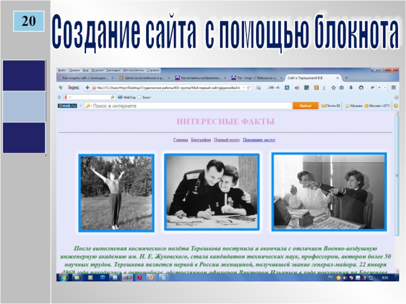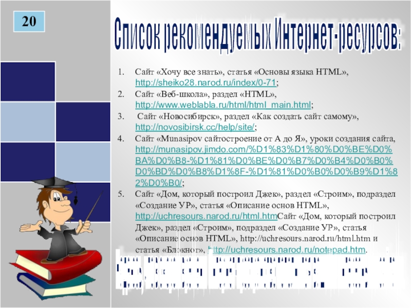 http://sheiko28.narod.ru/index/0-71; Сайт «Веб-школа», раздел «HTML», http://www.weblabla.ru/html/html_main.html; Сайт «Новосибирск», раздел «Как создать сайт самому», http://novosibirsk.cc/help/site/; Сайт «Munasipov cайтостроение от А до Я», уроки создания сайта, http://munasipov.jimdo.com/%D1%83%D1%80%D0%BE%D0%BA%D0%B8-%D1%81%D0%BE%D0%B7%D0%B4%D0%B0%D0%BD%D0%B8%D1%8F-%D1%81%D0%B0%D0%B9%D1%82%D0%B0/; Сайт «Дом, который построил Джек», раздел «Строим», подраздел «Создание УР», статья «Описание основ HTML», http://uchresours.narod.ru/html.htmСайт «Дом, который построил Джек», раздел «Строим», подраздел «Создание УР», статья «Описание основ HTML», http://uchresours.narod.ru/html.htm и статья «Блокнот», http://uchresours.narod.ru/notepad.htm. 20