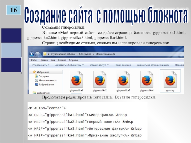 gipperssilka3.html, gipperssilka4.html. Страниц необходимо столько, сколько вы запланировали гиперссылок. Создание сайта с помощью блокнота