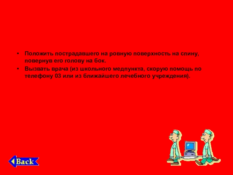 Положить пострадавшего на ровную поверхность на спину, повернув