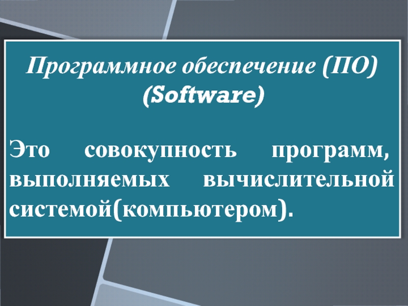 Это совокупность программ,  выполняемых вычислительной системой(компьютером).Программное обеспечение (ПО) (Software)
