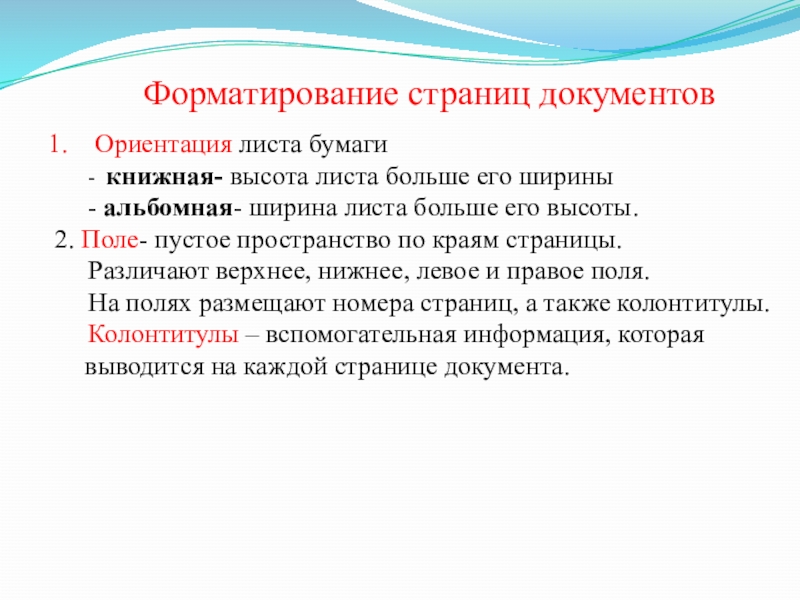 Форматирование страниц документовОриентация листа бумаги   - книжная- высота листа больше его ширины   -