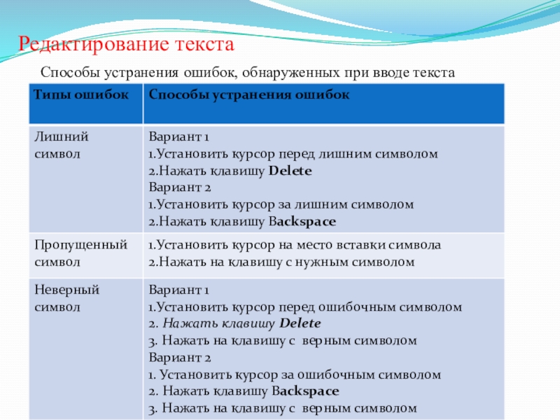 Редактирование текстаСпособы устранения ошибок, обнаруженных при вводе текста