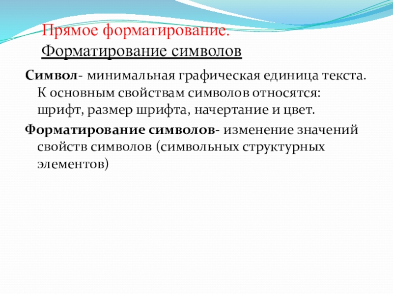 Прямое форматирование.  Форматирование символовСимвол- минимальная графическая единица текста. К основным свойствам символов относятся: шрифт, размер шрифта,