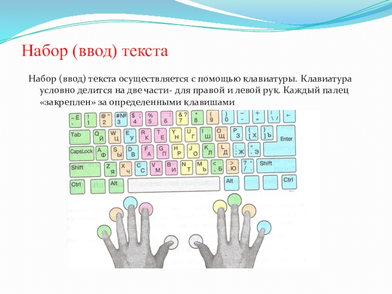 Набор (ввод) текстаНабор (ввод) текста осуществляется с помощью клавиатуры. Клавиатура условно делится на две части- для правой