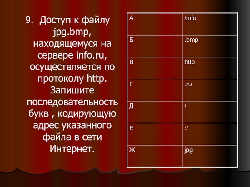 9. Доступ к файлу jpg.bmp, находящемуся на сервере info.ru, осуществляется по протоколу http. Запишите последовательность букв ,