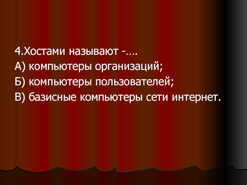 4.Хостами называют -….А) компьютеры организаций;Б) компьютеры пользователей;В) базисные компьютеры сети интернет.