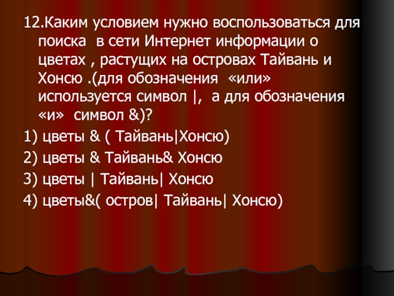 12.Каким условием нужно воспользоваться для поиска в сети Интернет информации о цветах , растущих на островах Тайвань