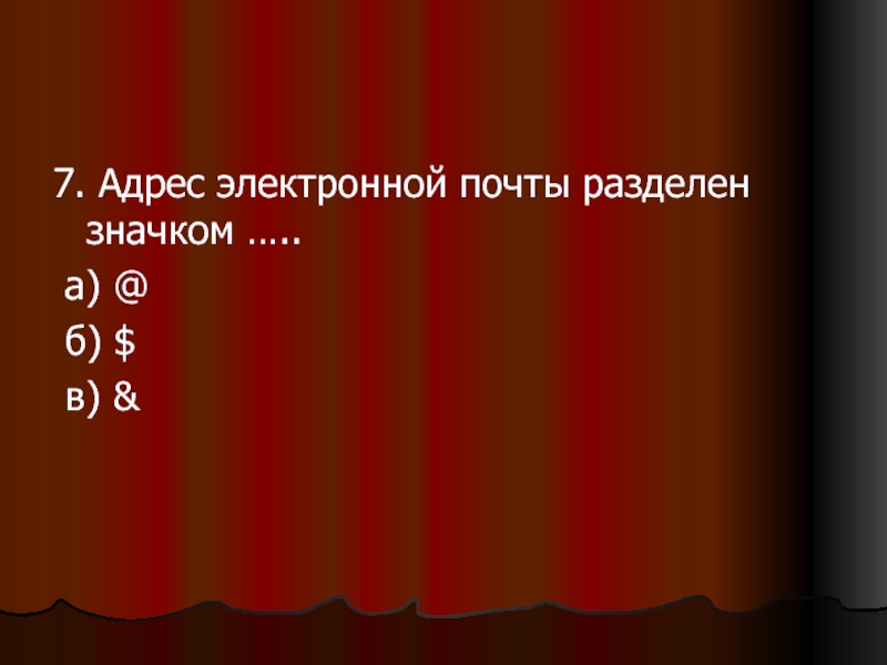 7. Адрес электронной почты разделен значком ….. а) @ б) $ в) &