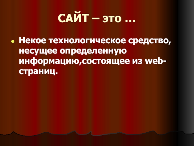САЙТ – это … Некое технологическое средство, несущее определенную информацию,состоящее из web-страниц.