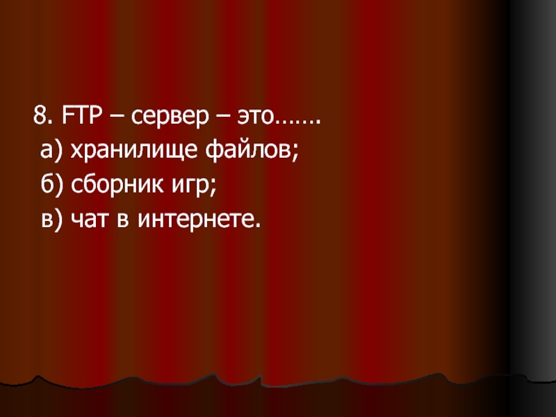 8. FTP – сервер – это……. а) хранилище файлов; б) сборник игр; в) чат в интернете.