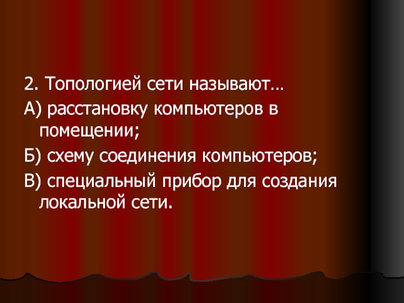2. Топологией сети называют…А) расстановку компьютеров в помещении;Б) схему соединения компьютеров;В) специальный прибор для создания локальной сети.