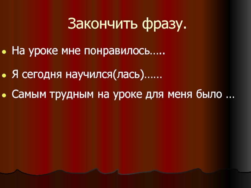 Закончить фразу.На уроке мне понравилось…..Я сегодня научился(лась)……Самым трудным на уроке для меня было …