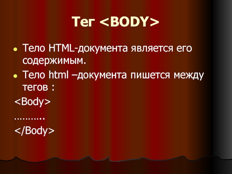 Тег Тело HTML-документа является его содержимым. Тело html –документа пишется между тегов :………..