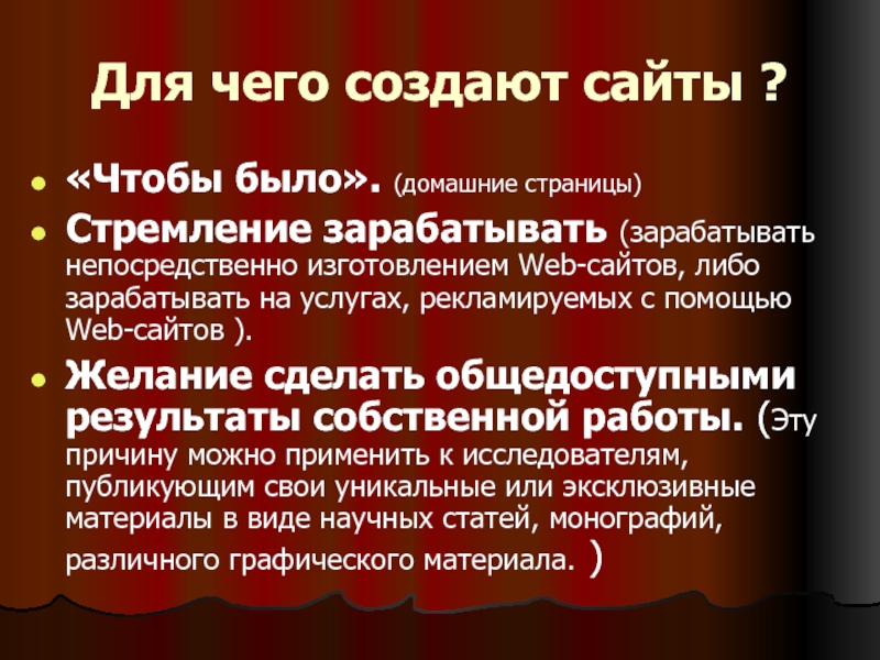 Для чего создают сайты ? «Чтобы было». (домашние страницы)Стремление зарабатывать (зарабатывать непосредственно изготовлением Web-сайтов, либо зарабатывать на