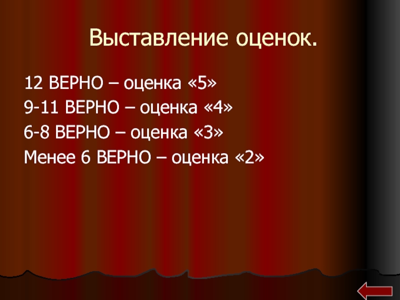 Выставление оценок.12 ВЕРНО – оценка «5»9-11 ВЕРНО – оценка «4»6-8 ВЕРНО – оценка «3»Менее 6 ВЕРНО –