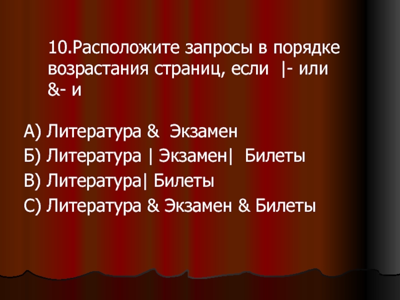 10.Расположите запросы в порядке возрастания страниц, если |- или &- иА) Литература & ЭкзаменБ) Литература | Экзамен|