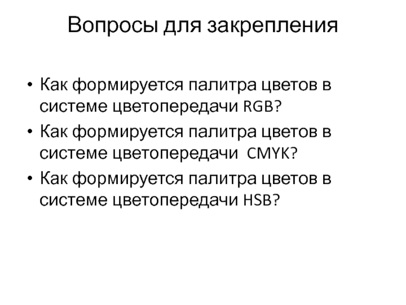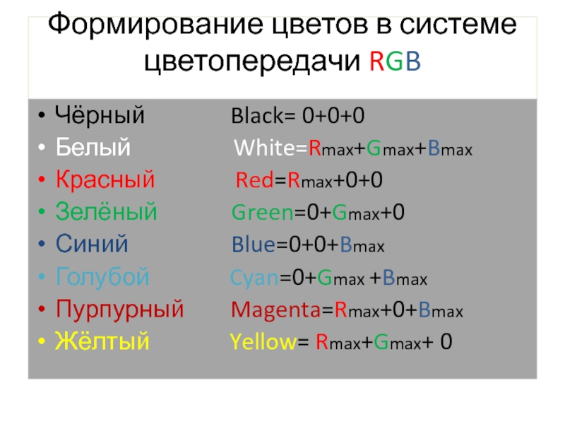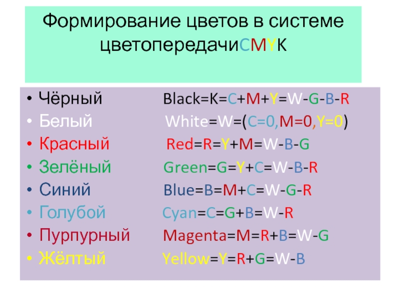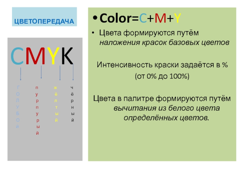 Цвета в палитре формируются путём вычитания из белого цвета определённых цветов.