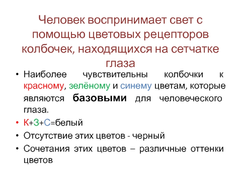 Наиболее чувствительны колбочки к красному, зелёному и синему цветам, которые являются базовыми для человеческого глаза.