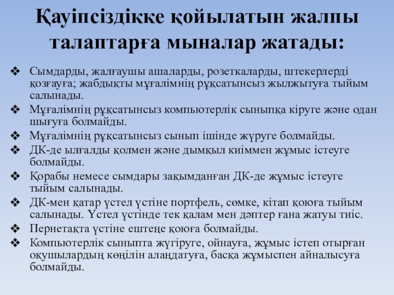 Қауіпсіздікке қойылатын жалпы талаптарға мыналар жатады: Сымдарды, жалғаушы ашаларды, розеткаларды, штекерлерді қозғауға; жабдықты мұғалімнің рұқсатынсыз жылжытуға тыйым