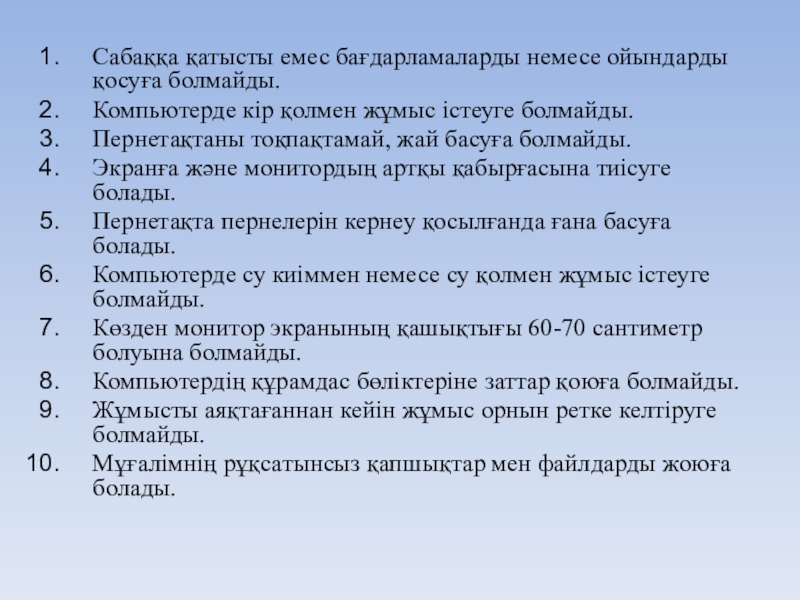 Сабаққа қатысты емес бағдарламаларды немесе ойындарды қосуға болмайды. Компьютерде кір қолмен жұмыс істеуге болмайды.Пернетақтаны тоқпақтамай, жай басуға