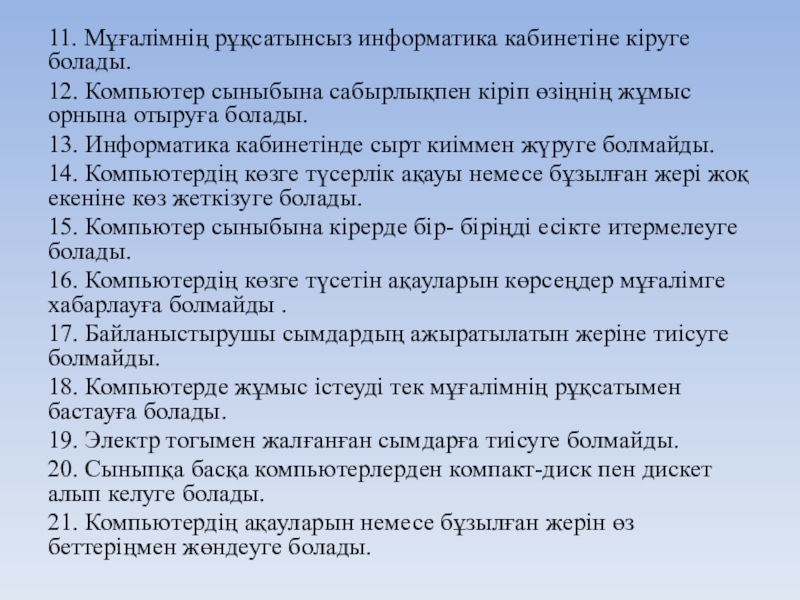 11. Мұғалімнің рұқсатынсыз информатика кабинетіне кіруге болады. 12. Компьютер сыныбына сабырлықпен кіріп өзіңнің жұмыс орнына отыруға болады.