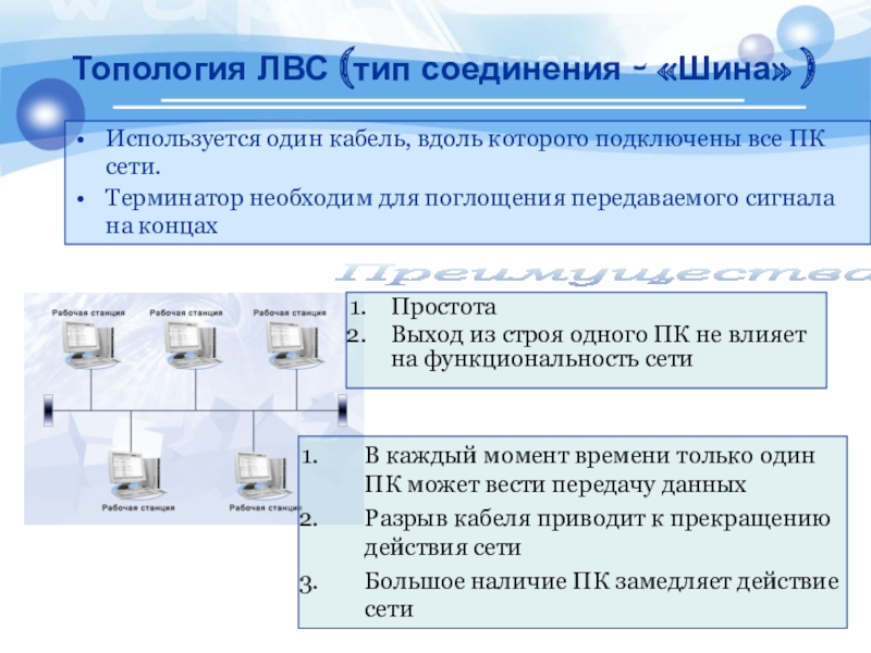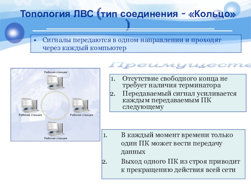 Выход одного ПК из строя приводит к прекращению действия всей сети