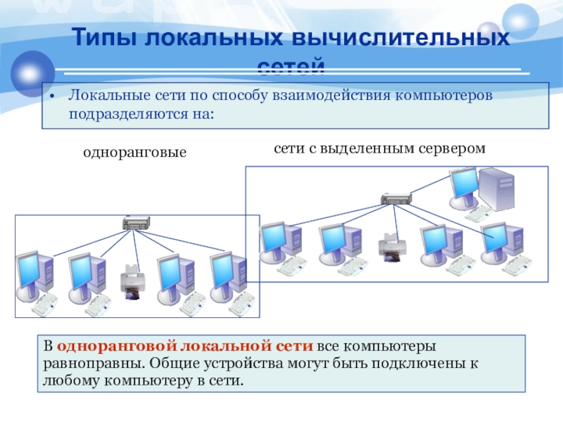 В одноранговой локальной сети все компьютеры равноправны. Общие устройства могут быть подключены к любому компьютеру в сети.
