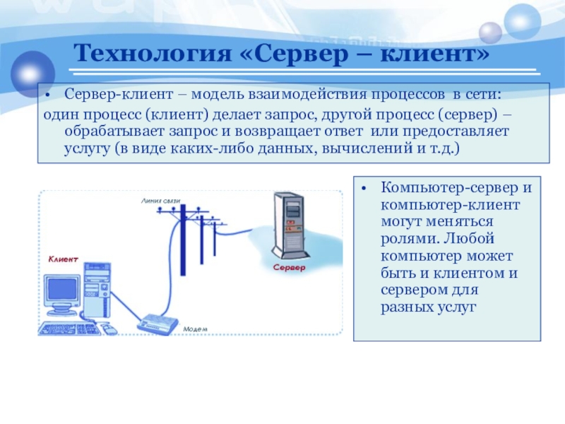 Компьютер-сервер и компьютер-клиент могут меняться ролями. Любой компьютер может быть и клиентом и сервером для разных услуг