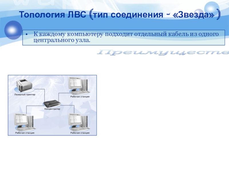 быстрый обмен информацией, совместное использование периферийных устройств (принтер, сканер, модем…)