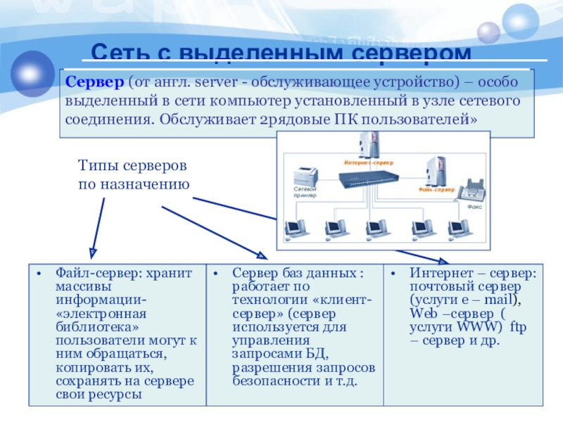 Файл-сервер: хранит массивы информации- «электронная библиотека» пользователи могут к ним обращаться, копировать их, сохранять на сервере свои ресурсы