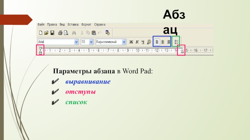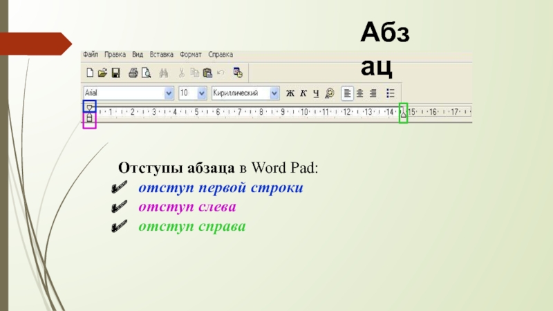 АбзацОтступы абзаца в Word Pad:отступ первой строкиотступ слеваотступ справа