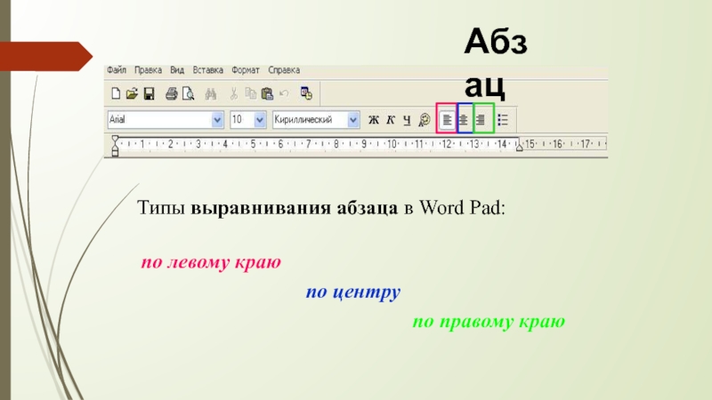 АбзацТипы выравнивания абзаца в Word Pad:по левому краюпо центрупо правому краю