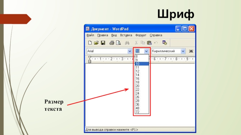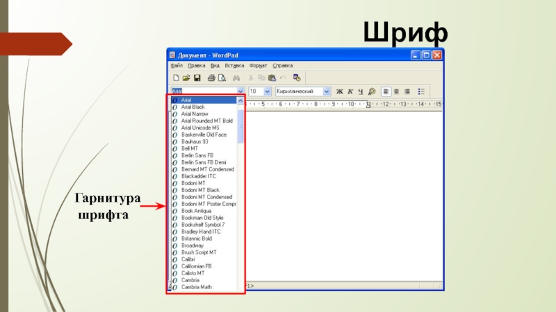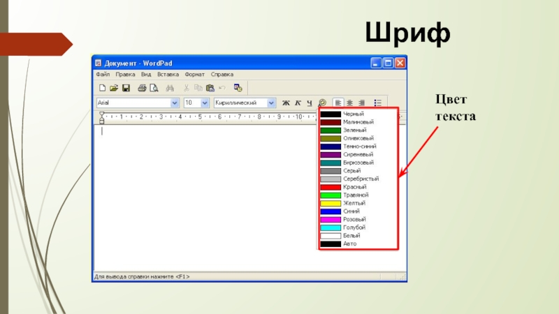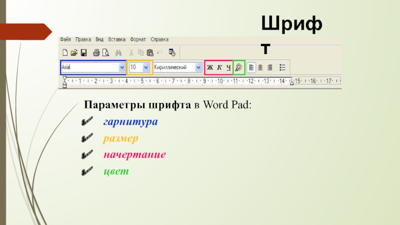 Параметры шрифта в Word Pad:гарнитураразмерначертаниецветШрифт