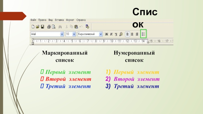 СписокПервый элементВторой элементТретий элементПервый элементВторой элементТретий элементМаркированныйсписокНумерованныйсписок