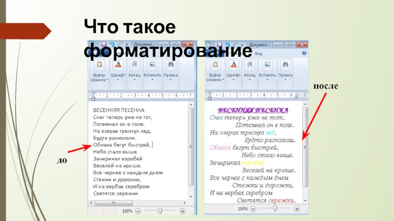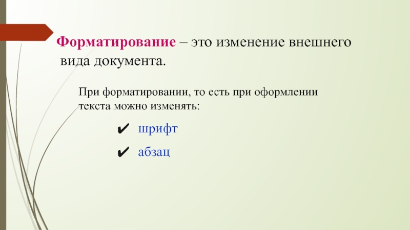 Форматирование – это изменение внешнего вида документа.При форматировании, то есть при оформлении текста можно изменять: шрифт абзац