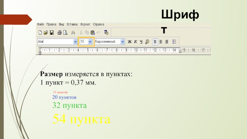 ШрифтРазмер измеряется в пунктах:  1 пункт = 0,37 мм. 12 пунктов20 пунктов32 пункта54 пункта