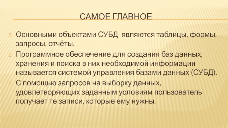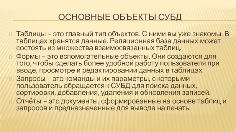 Основными объектами СУБД являются таблицы, формы, запросы, отчёты.