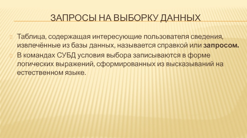 В командах СУБД условия выбора записываются в форме логических выражений, сформированных из высказываний на естественном языке.