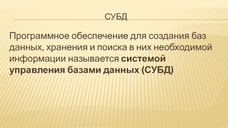создания баз данных, хранения и поиска в них необходимой информации называется системой управления базами данных (СУБД).