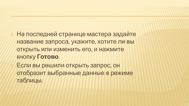 Слайд 15На последней странице мастера задайте название запроса, укажите, хотите ли вы