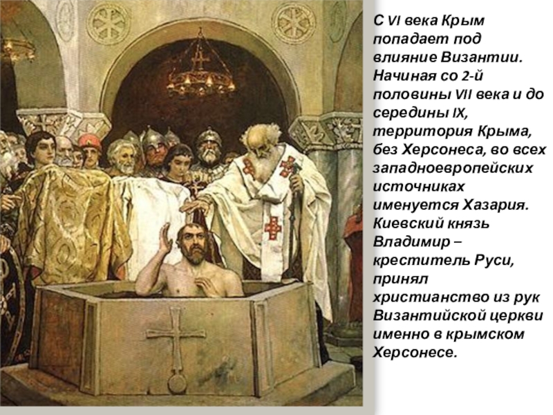Киевский князь Владимир – креститель Руси, принял христианство из рук Византийской церкви именно в крымском Херсонесе.