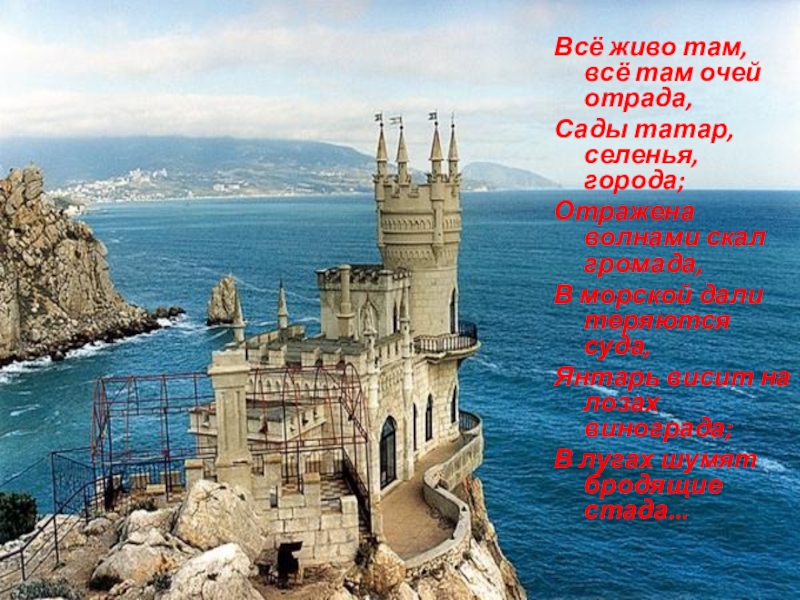 Всё живо там, всё там очей отрада,Сады татар, селенья, города;Отражена волнами скал громада,В морской дали теряются суда,Янтарь
