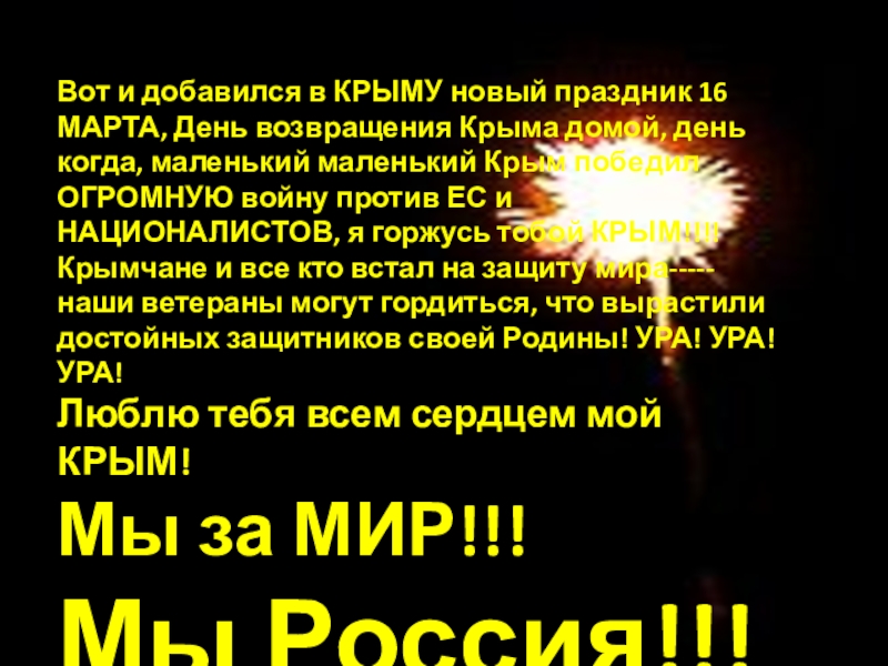 Крыма домой, день когда, маленький маленький Крым победил ОГРОМНУЮ войну против ЕС и НАЦИОНАЛИСТОВ, я горжусь тобой КРЫМ!!!! Крымчане и все кто встал на защиту мира----- наши ветераны могут гордиться, что вырастили достойных защитников своей Родины! УРА! УРА! УРА!