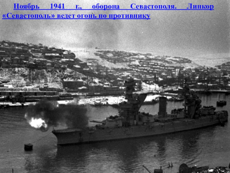 Слайд 23Ноябрь 1941 г., оборона Севастополя. Линкор «Севастополь» ведет огонь по противнику