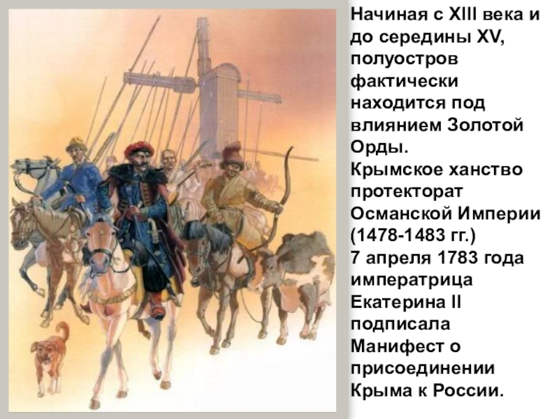 Начиная с XIII века и до середины XV, полуостров фактически находится под влиянием Золотой Орды.Крымское ханство протекторат