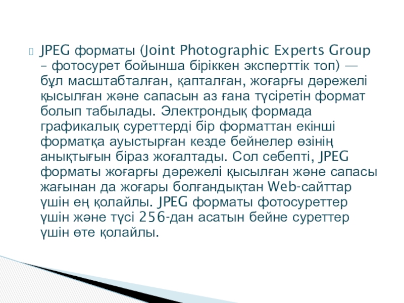топ) — бұл масштабталған, қапталған, жоғарғы дәрежелі қысылған және сапасын аз ғана түсіретін формат болып табылады. Электрондық формада графикалық суреттерді бір форматтан екінші форматқа ауыстырған кезде бейнелер өзінің анықтығын біраз жоғалтады. Сол себепті, JPEG форматы жоғарғы дәрежелі қысылған және сапасы жағынан да жоғары болғандықтан Web-сайттар үшін ең қолайлы. JPEG форматы фотосуреттер үшін және түсі 256-дан асатын бейне суреттер үшін өте қолайлы.