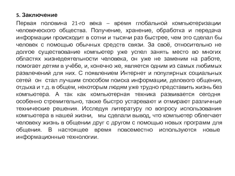 общества. Получение, хранение, обработка и передача информации происходит в сотни и тысячи раз быстрее, чем это сделал бы человек с помощью обычных средств связи. За своё, относительно не долгое существование компьютер уже успел занять место во многих областях жизнедеятельности человека, он уже не заменим на работе, помогает детям в учёбе, и, конечно же, является одним из самых любимых развлечений для них. С появлением Интернет и популярных социальных сетей он стал лучшим способом поиска информации, делового общения, отдыха и т.д. в общем, некоторым людям уже трудно представить жизнь без компьютера. А так как компьютерная техника развивается сегодня особенно стремительно, также быстро устаревают и отмирают различные технические решения. Исследуя литературу по вопросу использования компьютера в нашей жизни, мы сделали вывод, что компьютер облегчает человеку жизнь в общении друг с другом с помощью новых программ для общения. В настоящее время повсеместно используются новые информационные технологии.