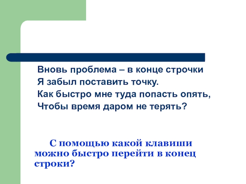 Вновь проблема – в конце строчки	Я забыл поставить точку.	Как быстро мне туда попасть опять,	Чтобы время даром не