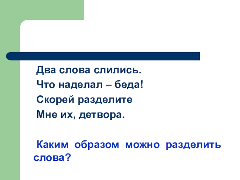 Два слова слились.	Что наделал – беда!	Скорей разделите	Мне их, детвора.	Каким образом можно разделить слова?